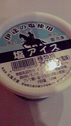 それで、なんとなくナンジャタウンに行ってきました。昨日の予定ではPalcoだったのにね、チーズケーキが食べたくて。ざんねんながら日替わりだったのですが美味しかったですよ。ただクレープのにおいに酔ってダウンしかけただけで。でも相当がんばってレアチーズケーキとベイクドチーズケーキ(ホット)とフルーツタルトを半分ずつ食べたですよ。で、ふらふらしているうちにアイスクリームのほうにきました。今日はかなり暑かったのでアイスアイスーとご当地アイスをぶらっと見て、見ているうちに↓のを発見したわけです。だって説明書きに「伊達の塩はダテじゃない」ってあってパッケージに筆頭が針立(※当家オリキャラ)がいたら買わないわけにはいかなくて、直前まで塩アイスは鼠の海のにかぎるとか言っていたのに……あーあ。味は予想を裏切ってふつうに美味しかったです。うっすら塩っていうか味の濃いバニラ。アイスミルク(風味)の表示にたがわぬ感じでした。見ているだけで楽しいですよ、あれ。牛たんとか、マムシとか。おもしろいのは相応に高いです。牧場やホテルのはふつうに美味しいので安全牌です。あ、そういえば二五○人前用だとかいう壷プリンがありました。味噌とかはいっていそうな外観の壷でプリンをつくって四万円です。ハーフサイズで二万円。アイスのほうでも同じような企画をやっていて、メガパフェスタ?らしいです。気になるけど気になるだけです。だってわたし戦力外。トルコアイスのところでは噂のチョコレート噴水を見ました。どこかではチョコフォンデュにできるそうですがこれも気になるだけです。服についたらこわいです。