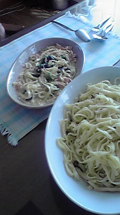 んで。父の余計な助言のせいで麺を2倍茹でてしまったので「どうにかしろ(by 父)」だったのでニンニクと鷹の爪をきざんでオリーブオイルで炒めて麺とからめて塩コショウで味を調えて即席ペペロンチーノです。父いわく、「トウガラシマーク3つくらい?」だそうで。後から来るんですね鷹の爪。
